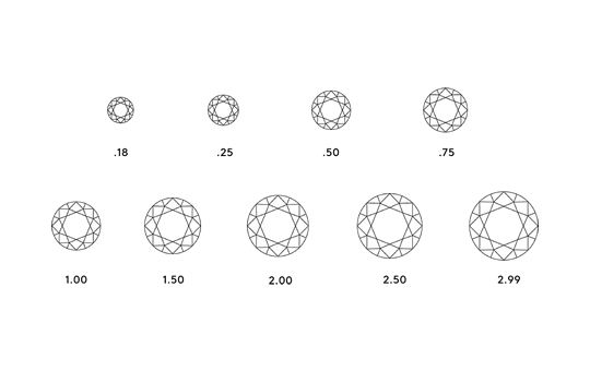 Un diamante de un quilate equivalia al peso de una semilla de algarrobo, pero en términos modernos, el quilate es una medidda de peso estándar de 0.2 gramos. Cada quilate esta dividido en 100 puntos. Así que por ejemplo, un cuarto de quilate equivale a 25 puntos, escrito como 0.25; medio quilate equivale a 50 puntos o 0.50, etcétera.